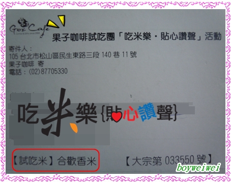 這次「吃米樂 貼心讚聲」活動是行政院農委會農糧署及財團法人CAS優良農產品發展協會委託果子咖啡辦理的,其中最重要的就是要告訴大家稻米產銷專業區的計畫,希望大家在選購好米時,可以認明「稻米產銷專區」生產的好米,請大家一定要幫忙多多宣傳喔~(稻米產銷專業區http://goodrice2010.blogspot.com/2010/04/blog-post.html)